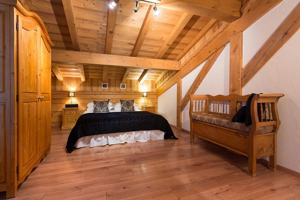 В интерьере спальной комнаты в стиле шале, расположенной в мансарде, в обязательном порядке присутствуют следующие атрибуты: