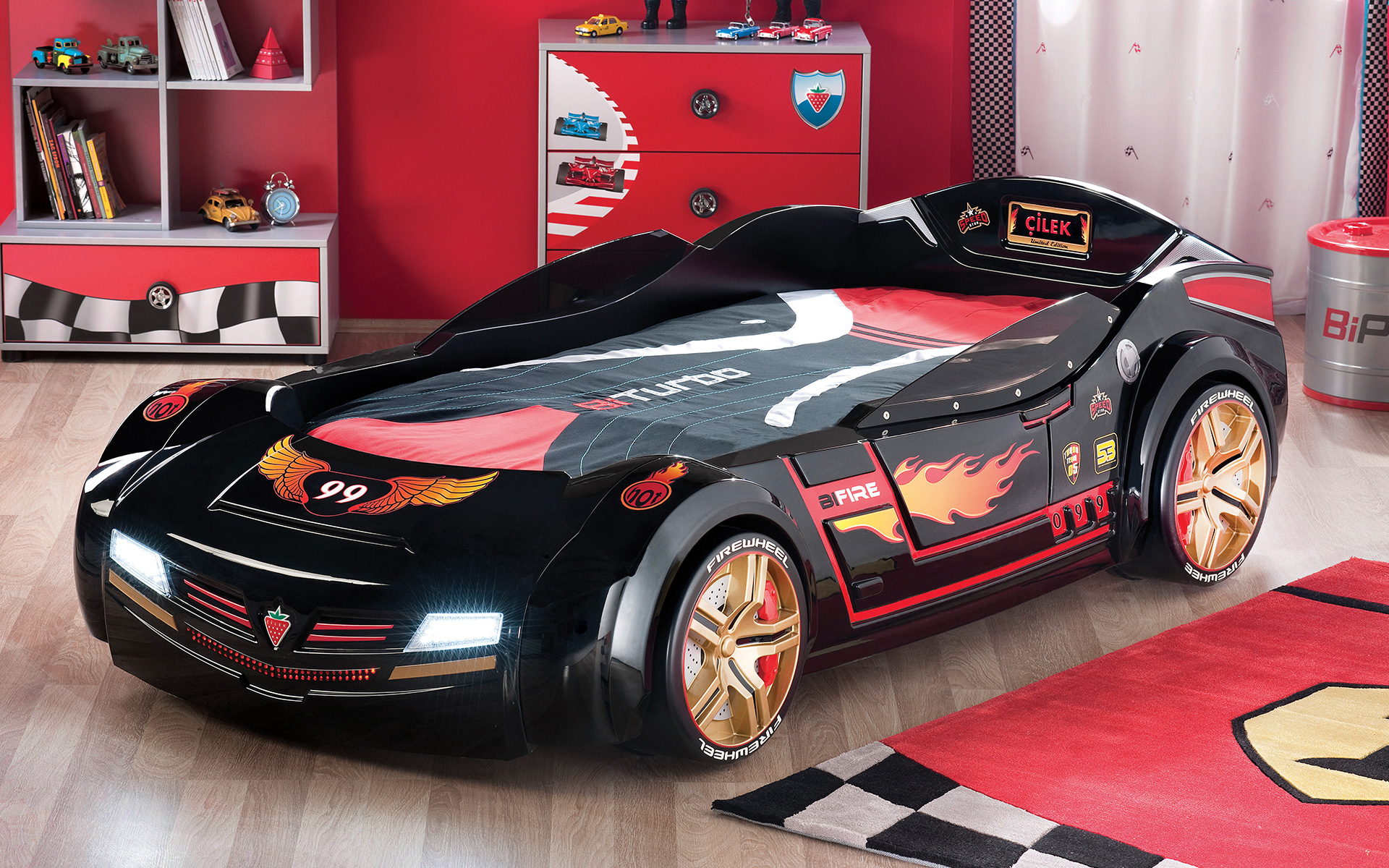 - Колеса, имитирующие колеса автомобиля, придающие кровати особую мобильность и легкость перемещения по комнате.