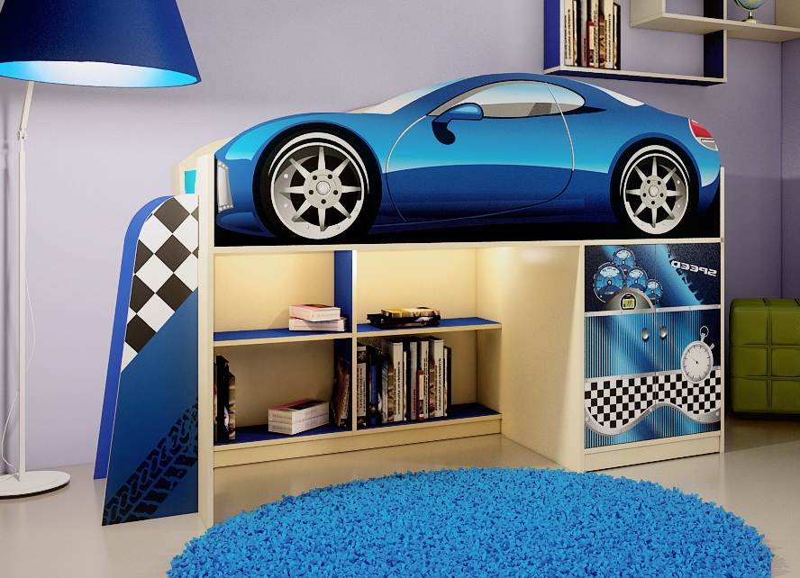 Двухъярусная кровать-машинка – хорошим вариант в интерьера детской, и поможет освободить пространство и тем самым поместить в комнате два спальных места.