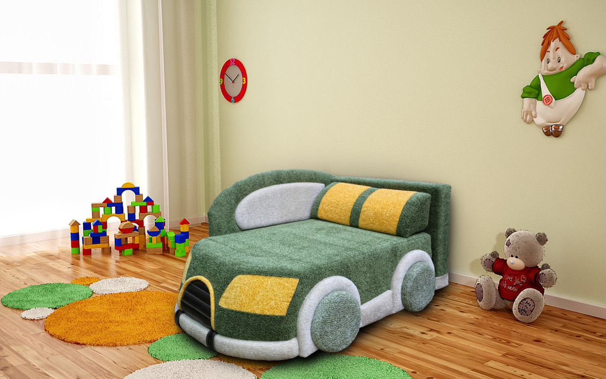 Хорошим решением станет трансформирующаяся мебель, например диван, который раскладывается, или кровать с ящиками для хранения. Особую привлекательность для детей представляет кровать в виде машины. Особенно такая модель понравится мальчикам. Данные изделия также могут иметь ящики для хранения и другие аксессуары: светящиеся фары или подсветку по периметру. Дизайн данных кроватей может быть разным. Сегодня популярны персонажи мультфильма «Тачки» (кроватка «молния Маквин») и кровать-машина «Мерседес». Также можно приобрести специальный комплект детского постельного белья с тематикой «Тачки».