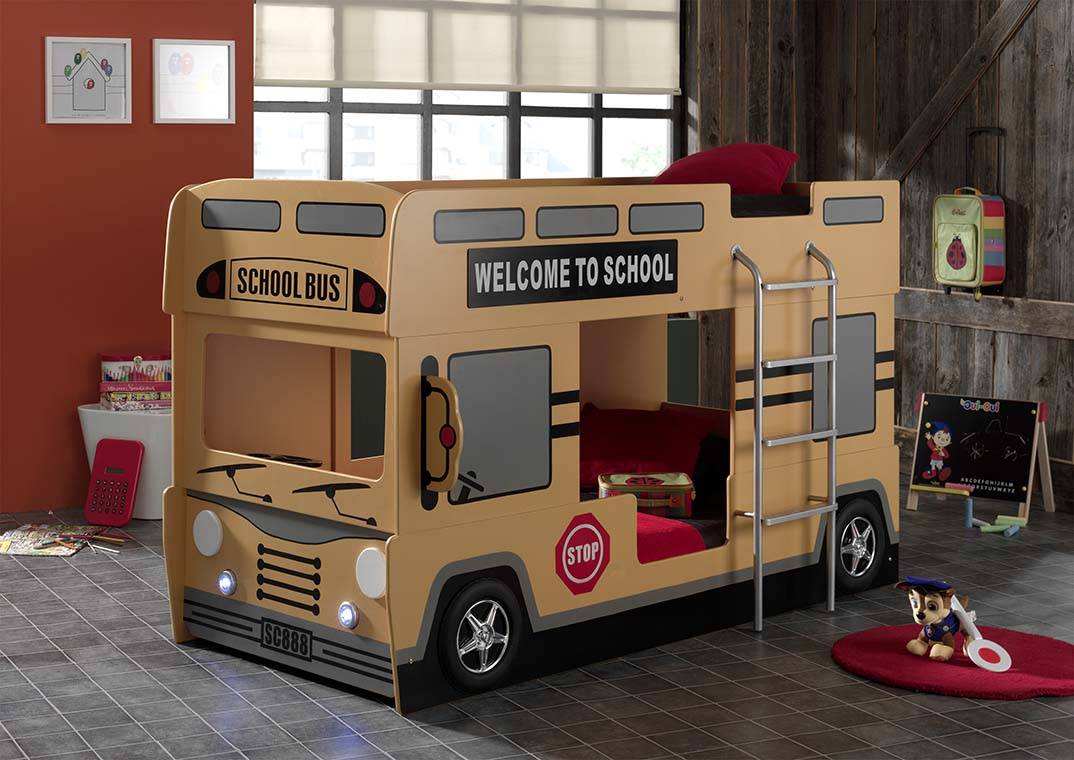 - Если спальную зону нужно организовать для двоих непосед, выбирают двухъярусные кровати, стилизованные под автобус или грузовик. Несмотря на то, что подобные конструкции оснащены всеми необходимыми перегородками и лестницами, стоит помнить о безопасности — двухъярусные изделия рекомендованы для детей старше 5 лет.
