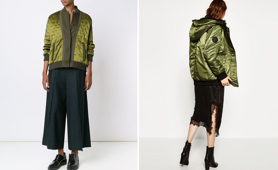 Оттенок хаки – классика для бомбера. Этот практичный немаркий тон популярен для создания курток для межсезонья. Повседневный лук с джинсами или образ роковой соблазнительницы в кожаных черных штанах дополнит бомбер хаки. Интересным вариантом станут яркие оттенки на фоне сдержанного хаки.