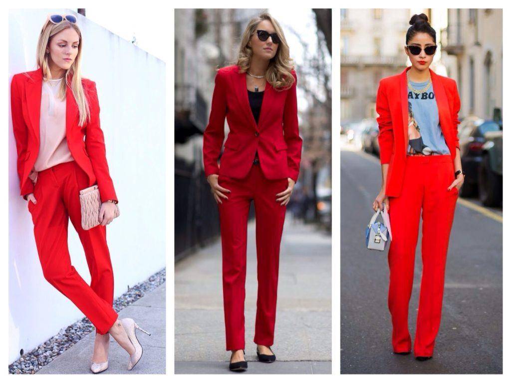 Важно! Выбирать оттенок следует в согласии с типом цвета и внешностью. Может так случиться, что неверно выбранный цвет одежды затмит саму обладательницу стильной вещи.Костюм красного цвета подходит для походов на работу, если дресс-код предприятия позволяет применение ярких цветов