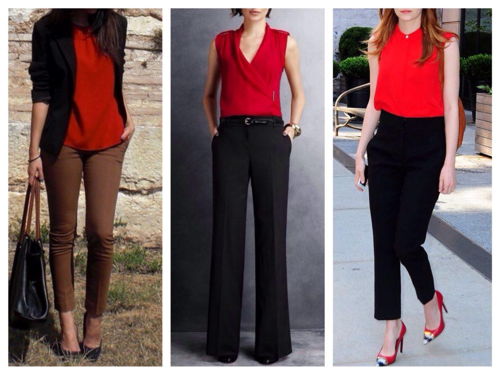 Черная или белая блузка в сочетании с красным брючным костюмом создадут классический и элегантный образ. Одновременно яркий и строгий, этот стиль подходит для офисной работы или для особых мероприятий.