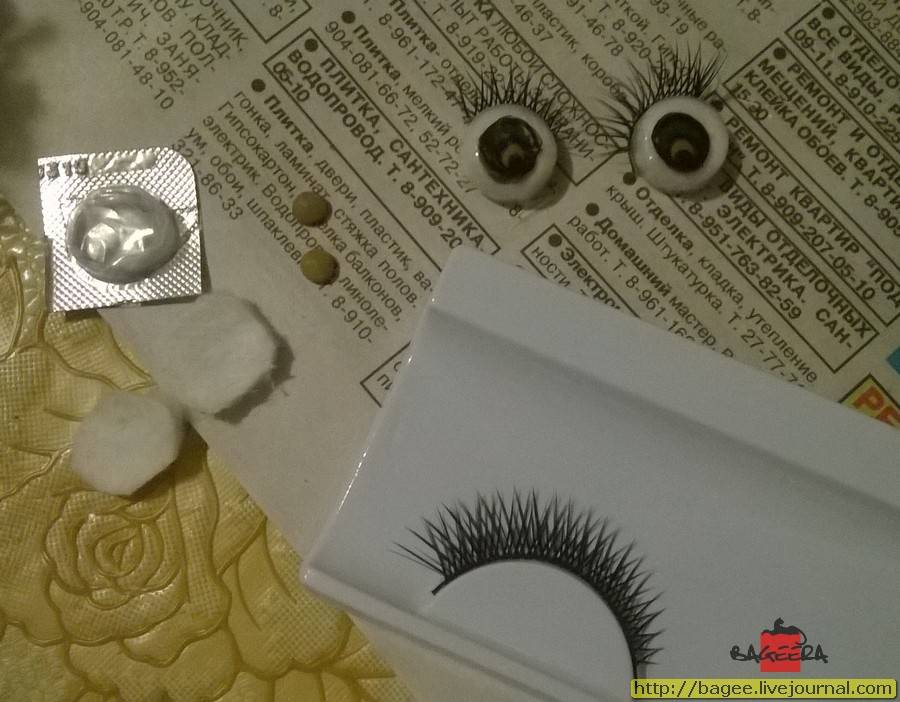 Осталось приклеить накладные ресницы (из магазина Фикс-прайс) и контур глаза обвести чёрным маркером: