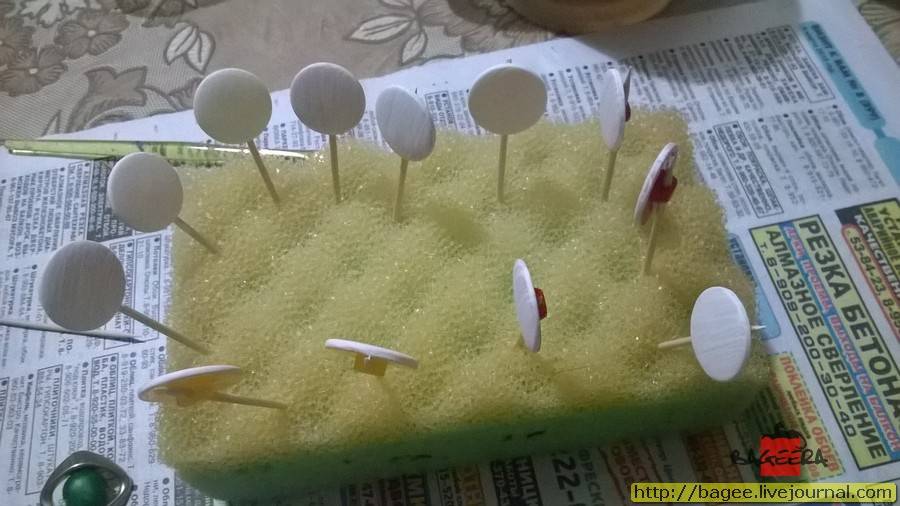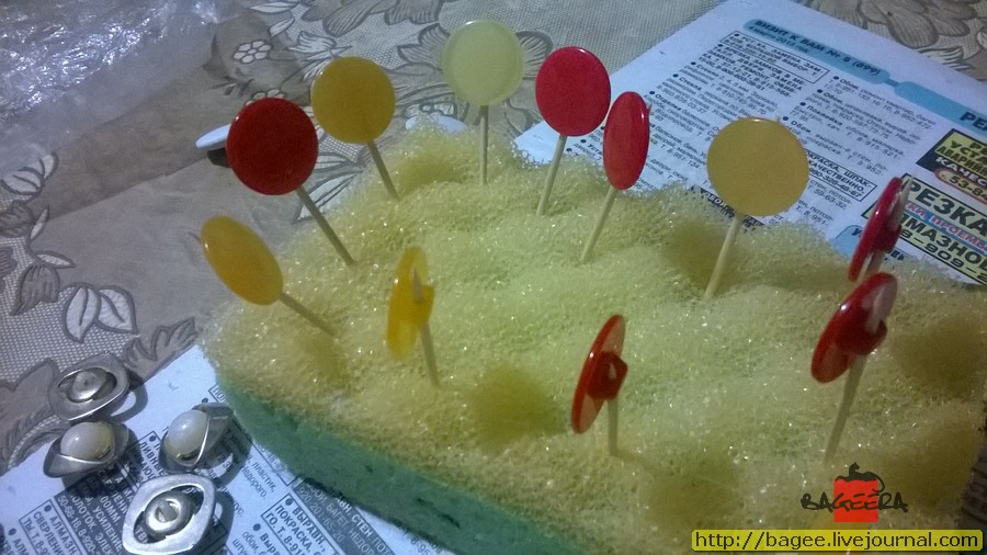 Втыкаю на зубочистках в старую мочалку выбранные пуговицы: