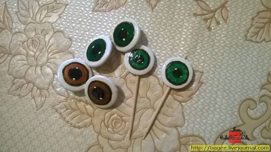 Вспоминаю, что гуашь уже высохла. Контурами крашу радужку у больших пуговиц, обвожу границы маркером, ставлю зрачок черным контуром (или маркером. уже не помню), наношу белые блики. После высыхания пуговицы покрываю бесцветным лаком для ногтей: