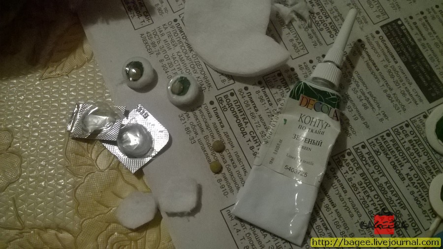 Параллельно беру блистер от таблеток, выравниваю ячейки, кружок от ватного диска вырезать по размеру таблетки и положить внутрь, предварительно покрасив в цвет радужки. Зрачок в моём случае — это зеленая чечевица. Приложила горошину сразу на акриловый контур, пока сырое было: