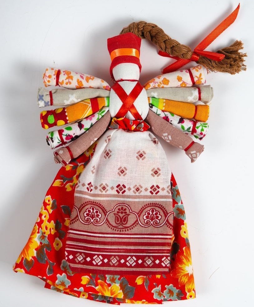 Не забудьте приготовить красную тесьму или нити и яркие ленты. Это обязательные атрибуты Десятиручки. Красный символизирует солнце, жизненную энергию и силу, а яркие оттенки лент, вплетенные в волосы ляльки, помогают поддерживать эту силу.