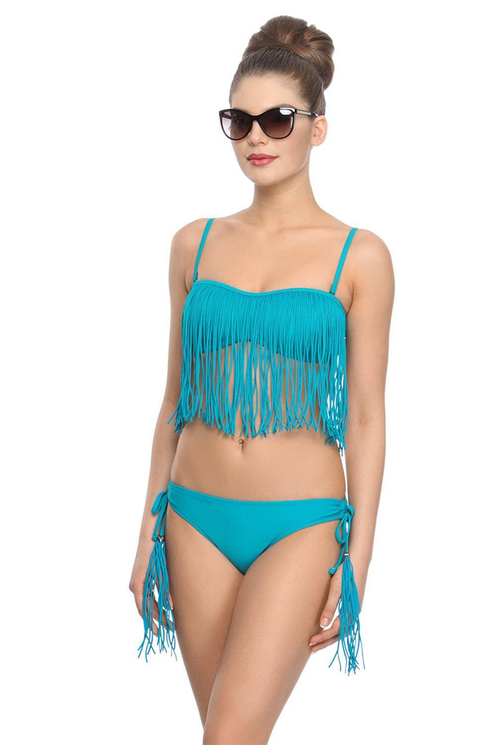 Оригинальный, но немного провокационный летний тренд этого сезона – вязаные купальники. Они приятны к телу и позволяют коже дышать. Могут быть выполнены полностью из вязаного полотна, но чаще всего ажурный лиф дополняют плавками из эластана. Очень выигрышно смотрятся вязаные модели в стиле этно, украшенные бахромой, обилием кисточек, шнуровкой. Основная проблема вязаных купальников – они могут растягиваться в воде. Лучшие варианты выполняют из пряжи, уверенно сохраняющей форму, или сажают ажурные элементы на подкладку, по цвету приближающуюся к оттенку кожи.