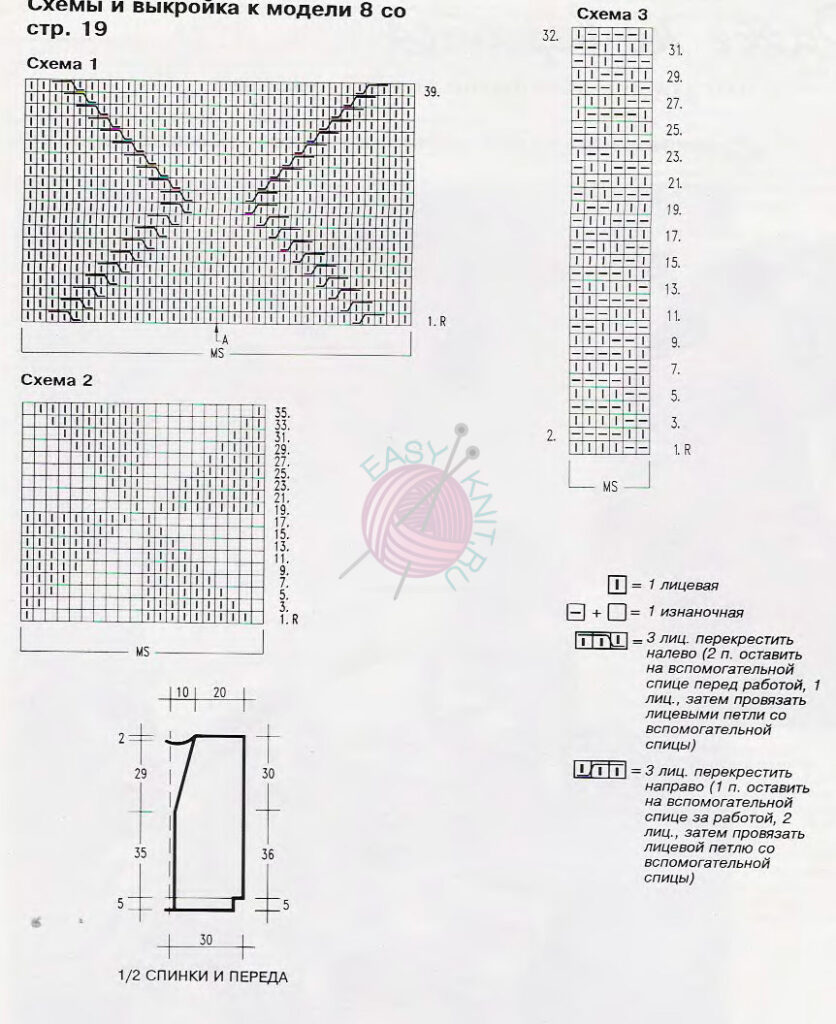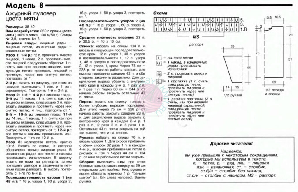 Вязать согл. схеме. На ней даны лицевые ряды. В изнаночных рядах петли и накиды провязывать изнаночными. Раппорт постоянно повторять, закончить петлей после раппорта.