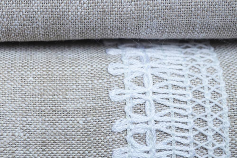 Льняные волокна экологичны. Их могут использовать люди подверженные аллергии. Помимо этого они пропускают воздух, сохраняют тепло. Это послужило причиной активного использовать материал для изготовления постельных принадлежностей, скатертей, покрывал. Специфическая структура льна требует соблюдать меру при украшении изделия. Лен совместим с кружевными вставками, вышивкой. Часто для украшения изделий используют кант, цветные шнуры.