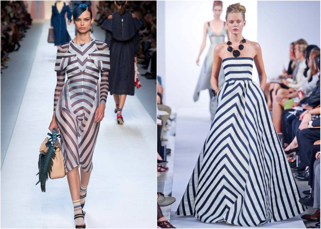 Из принтов допускается только полоска – никаких цветов, фауны или абстракции. Если раньше полоски располагались только горизонтально, то сегодня дизайнеры предлагают смело использовать вертикальные и косые полосы, а также комбинацию таких орнаментов в пределах одного изделия.