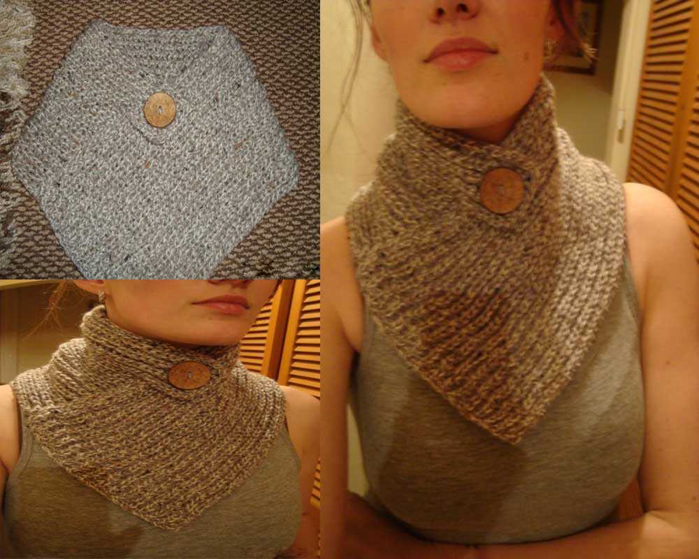 - Первый ряд изделия: три петельки подъема, четыре столбика с накидом в первую петлю цепи, три полустолбика, десять столбиков без накида. Второй: одна петелька для подъема, девять столбцов БН, три полустолбика СН, пять столбиков СН. Эти два рядка надо повторять столько раз, сколько необходимо для того, чтобы вышел прямоугольник, которым можно будет оборачивать шею. Можно создать маленький напуск. Это нам потребуется для присоединения краев пуговицами. По нижнему краю вещи набираем петли, делая расширение. Для этого в каждом пространстве между рядками свяжем столбец СН, а в арке междурядья должно выйти по 2 специальных элемента.