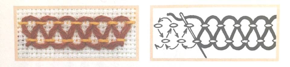 Выполняется следующим образом: сделав первый прокол с изнанки, выводят иглу на лицевую сторону, нить направляют наклонно вправо, делают петлю, зажимая нить большим пальцем левой руки по центру «елочки».