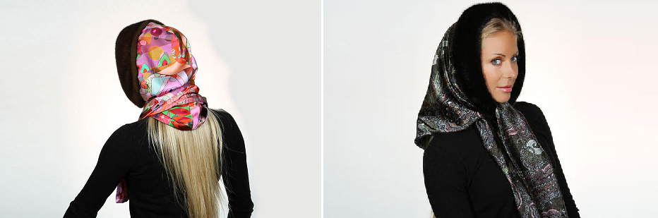 Дизайнеры предлагают интересные модели головных уборов, например, капор, который может подвязывать сзади на манер банданы. Его основная часть выполнена из цельной шкурки, а низ из плотной шелковой ткани. Капор надевается на голову, как капюшон, а с помощью шнурка затягивается, становясь банданой. Плотная ткань вполне способна заменить манишку или шейный платок.