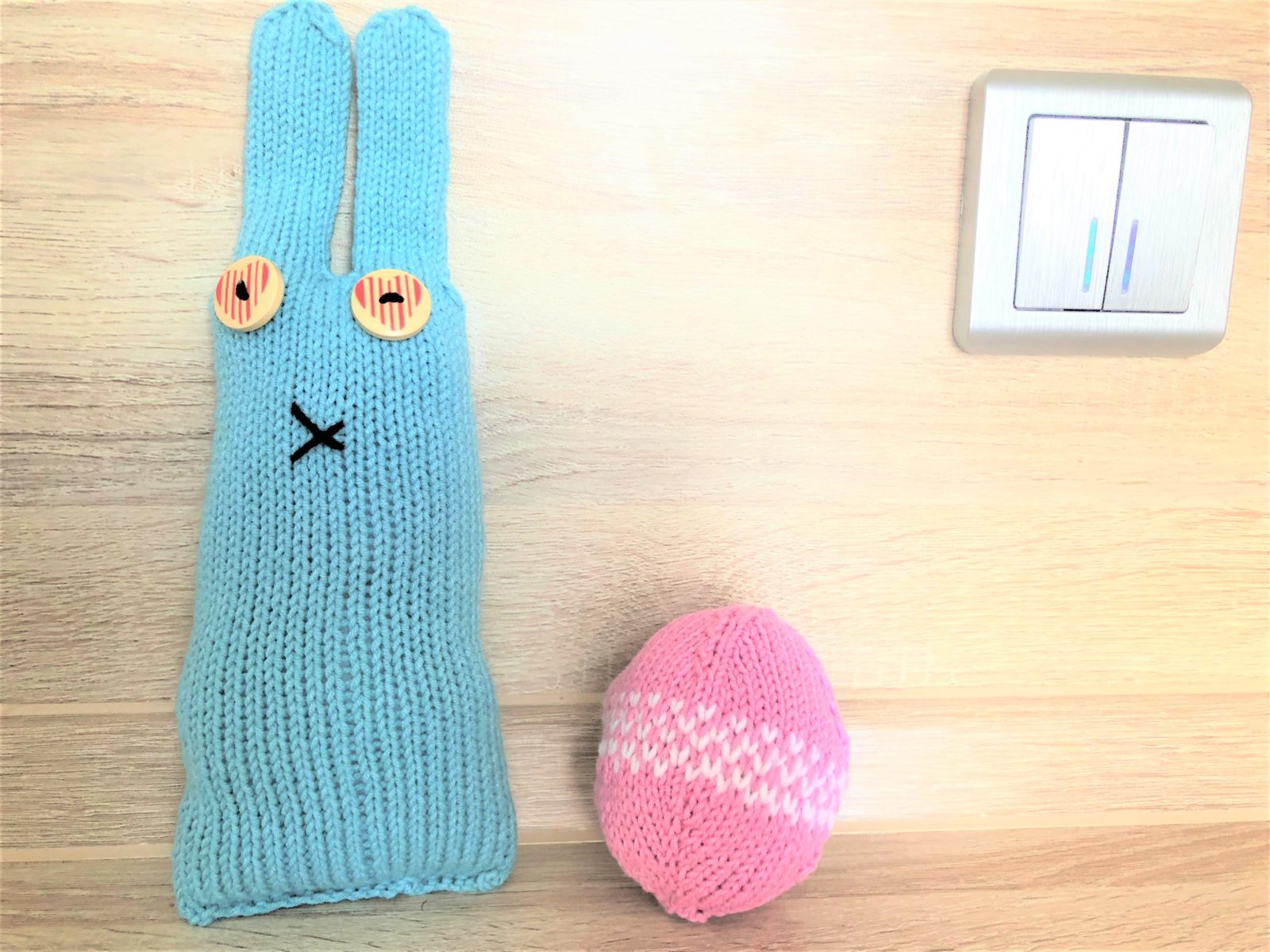 Вяжем также, как яйцо (смотри текст выше) жёлтой пряжей с ворсом. По ходу вязания, если вдруг покажется, что с изнаночной стороны цыплёнок пушистее, можно вывернуть это недовязанное яйцо наизнанку. Вязать белой ниткой яичную скорлупу уже в другую сторону, по новой лицевой стороне. Сверху белую шляпку вяжем отдельно (точно также, как и то место, где она будет лежать). Держаться она будет бантиком на макушке. Иголкой с ниткой протыкаем макушку, делаем один стежок, концы нити завязываем бантиком.
