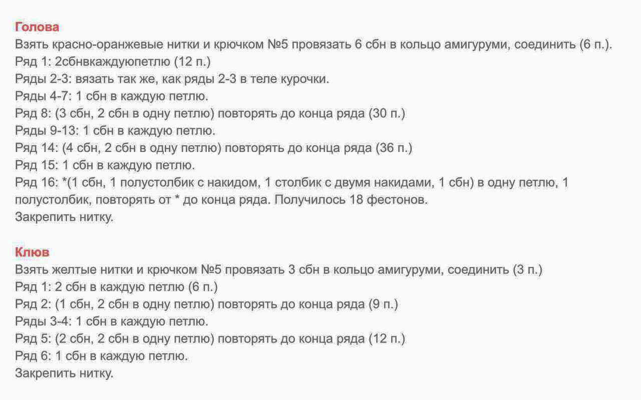 4 ряд – обвязать весь ряд столбиками без накида, остановиться напротив середины головы курочки, примерно напротив глаза, оставить белую нитку в сторону. Взять нитки другого цвета, вязать 2 столбика с накидом, 3 воздушные петли, 2 столбика с накидом в арку из воздушной петли. Этот узор повторить 7 раз так, чтобы получился хвостик курочки. Потом перевернуть и снова 7 раз связать этот же узор.