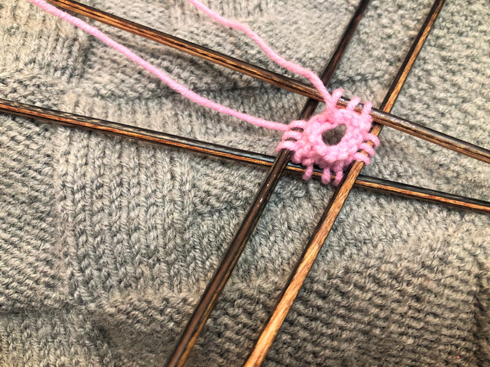- 1 ряд: в петельку делаем 7 столбиков и затягиваем в круг.
