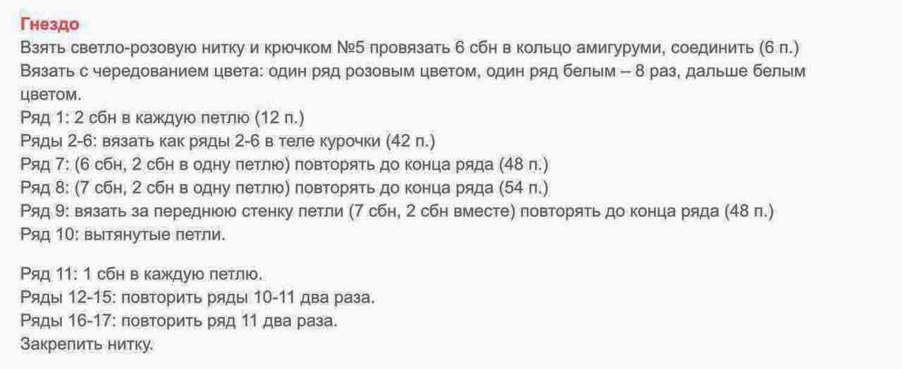 При вязании крючком номер 5 (а следовательно, не из тонких ниток) она получится длиной 20 см и высотой 8. Размер гнезда – 15 см, яичка – 3х4.