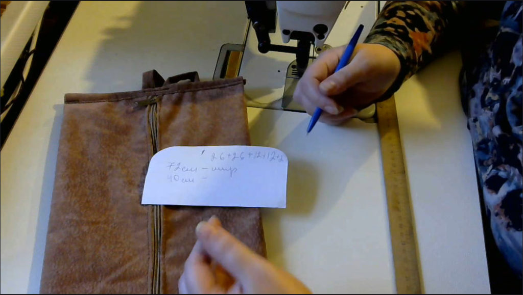 Дальше, нам нужна высота. Здесь у меня 10 см, но я бы вам рекомендовала добавить еще 2-3-4 см. Конечно, не хотелось бы, чтобы наша обувь сильно болталась по этому мешку, но, в любом случае, вы оставите себе возможность для вариаций, и для удобного хранения. Все-таки зажимать ее тканью было бы не очень хорошо, потому что храниться ей придется примерно 9 месяцев. У меня это зимняя обувь, соответственно, на зиму 3 месяца, там плюс — минус, и все оставшееся она у меня будет лежать в шкафу. И скорее всего на ней будет лежать какая-то другая обувь. Поэтому, и так ее будет придавливать чем-то, и, желательно, чтобы она во время хранения не сжималась. Поэтому мой мешочек будет высотой 12 см в готовом виде. Соответственно, наши расчеты : ширина – 26 см. в готовом виде. Плюс 26 см верхняя ширина, т.е у нас внизу 26 и вверху 26 см. Плюс боковинка для сапожек моих – 12 см, и с другой стороны 12 см. Значит, 12+12 и плюс 2 см — для подгиба на молнию. Считаем. 26+26=52+24=76+2=78 см. Итого, длина отреза должна быть 72 см. Так как высота будет 40 см., то 72 на 40 см мне нужно выкроить отрез, для того, чтобы получить мешок для моих полусапожек. Соответственно, молния мне нужна 40 см, и плюс для обработки краев лента, давайте рассчитаем, сколько нам нужно ленты. 26+26, это в готовом виде, получаем 52, плюс нам нужно на подгибку 4 см с каждого края, т. е. сантиметр, сантиметр, и с этих углов, т. е 4 см, получаем 56 см только на обработку срезов, и плюс петелька 40 см. Получаем 96 см — нам нужна лента для обработки. Вот таким образом вы можете рассчитать ваши мешочки. Прежде, чем покупать материал, вы посчитайте, измерьте вашу обувь, какую вы хотите хранить, и сделайте себе для каждого мешка такие расчеты.