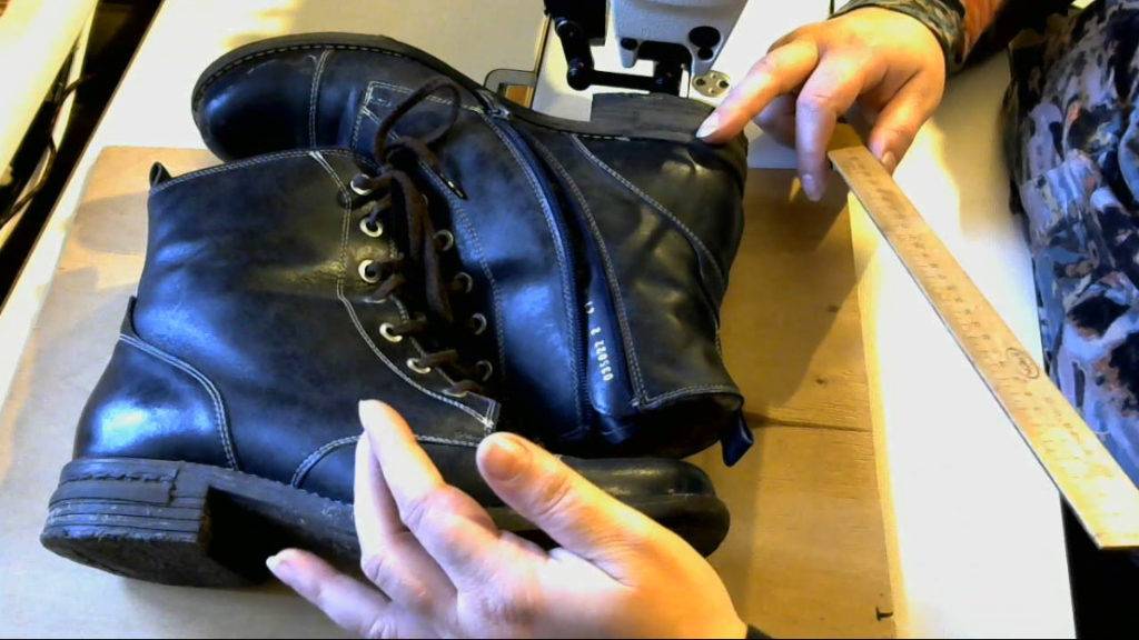 Длина. Я так же измеряю. Смотрю, что у меня здесь для комфортного хранения обуви ничего не сжимая, должно быть минимум 31 см. Для свободы можно добавить еще. Можем сделать те же 40 см, которые я делала для предыдущей обуви. И вы в дальнейшем этот мешочек можете использовать для других ботиночек, для другого сезона. Сумка для сапог в готовом виде должна быть 26 на 40 см.
