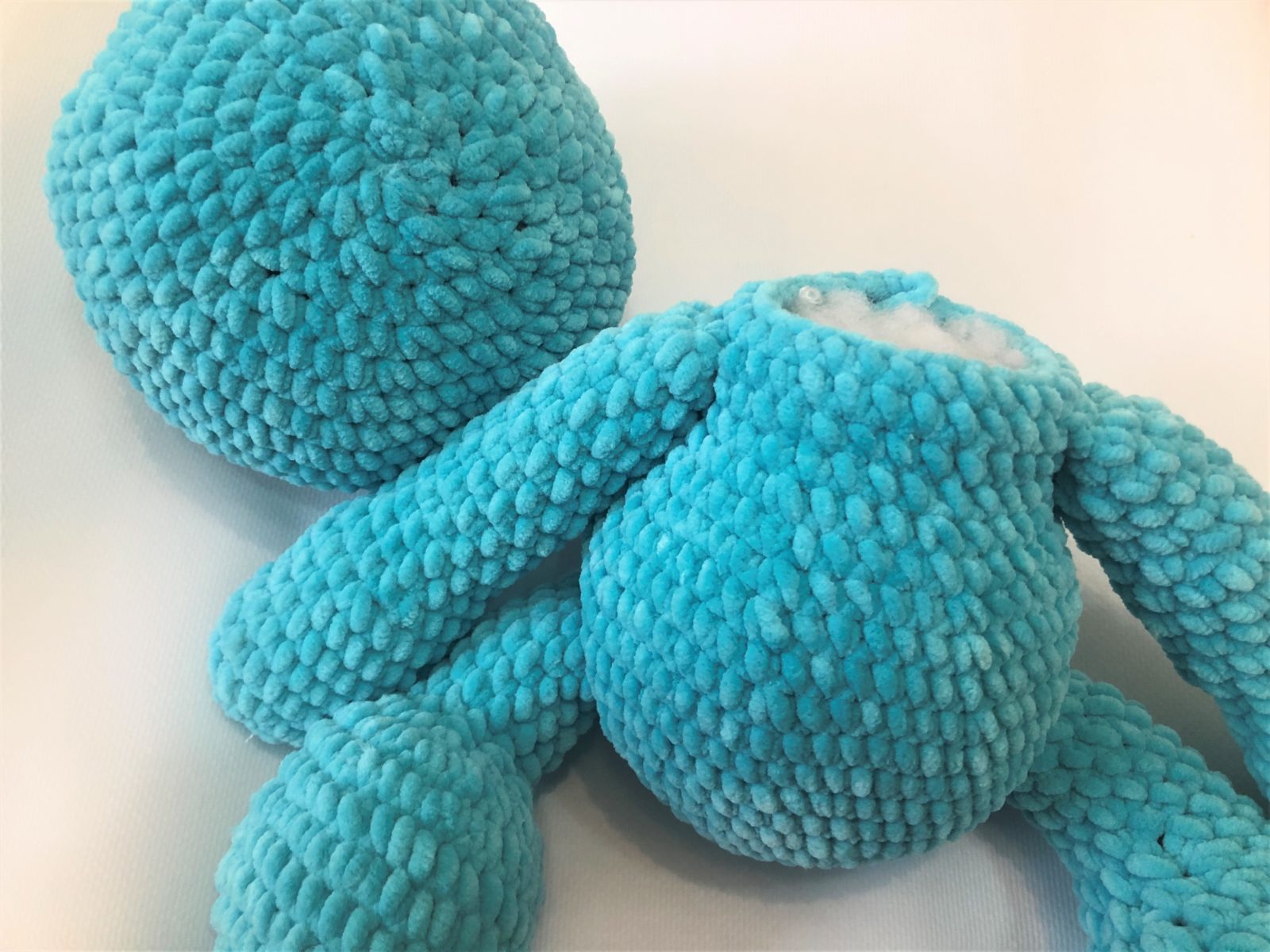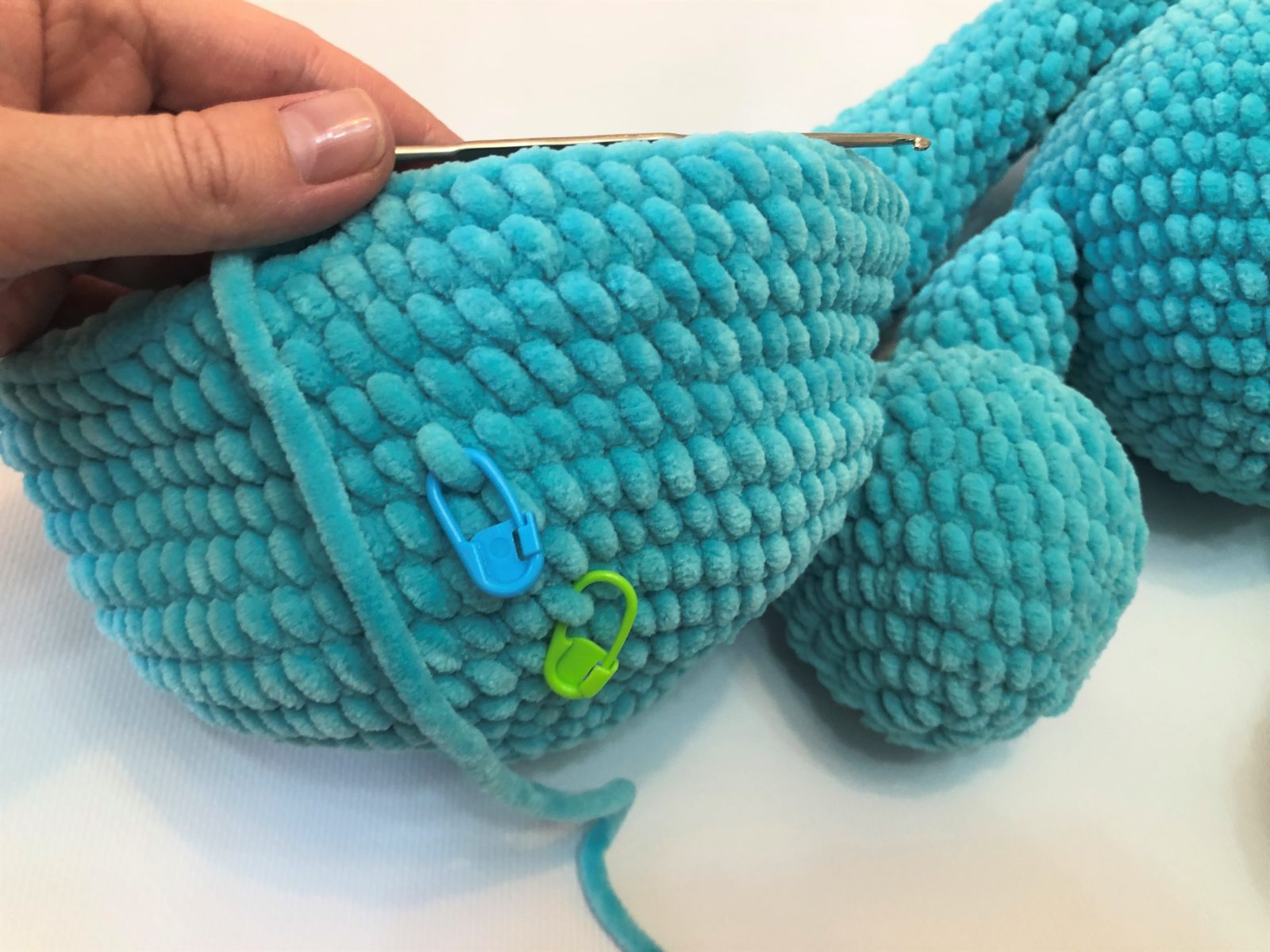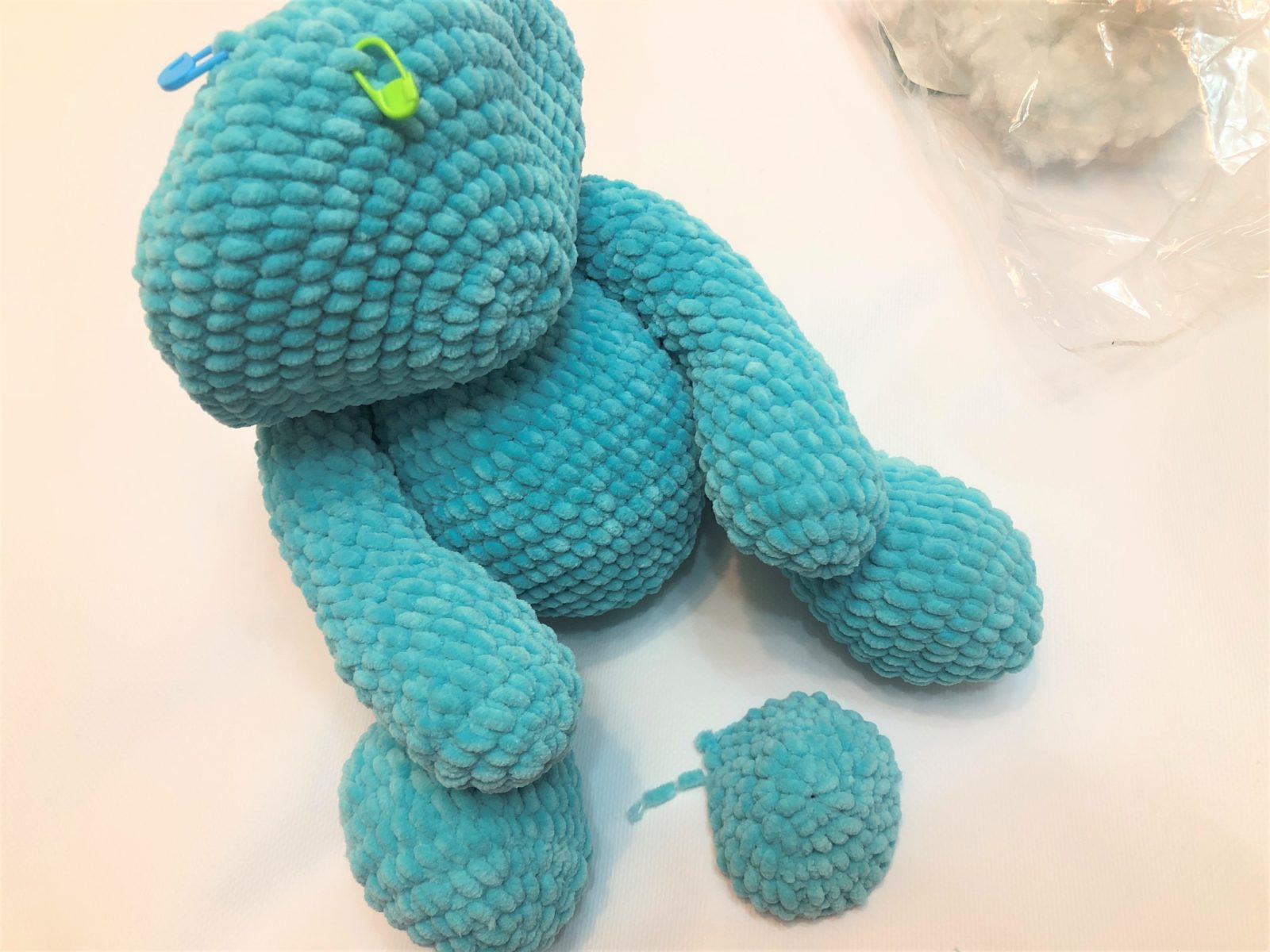 При вязании ножек важно правильно связать первый ряд. Это делается аналогичным способом, как и первый ряд мордочки, потому мастеру не составит большого труда повторить сделанное