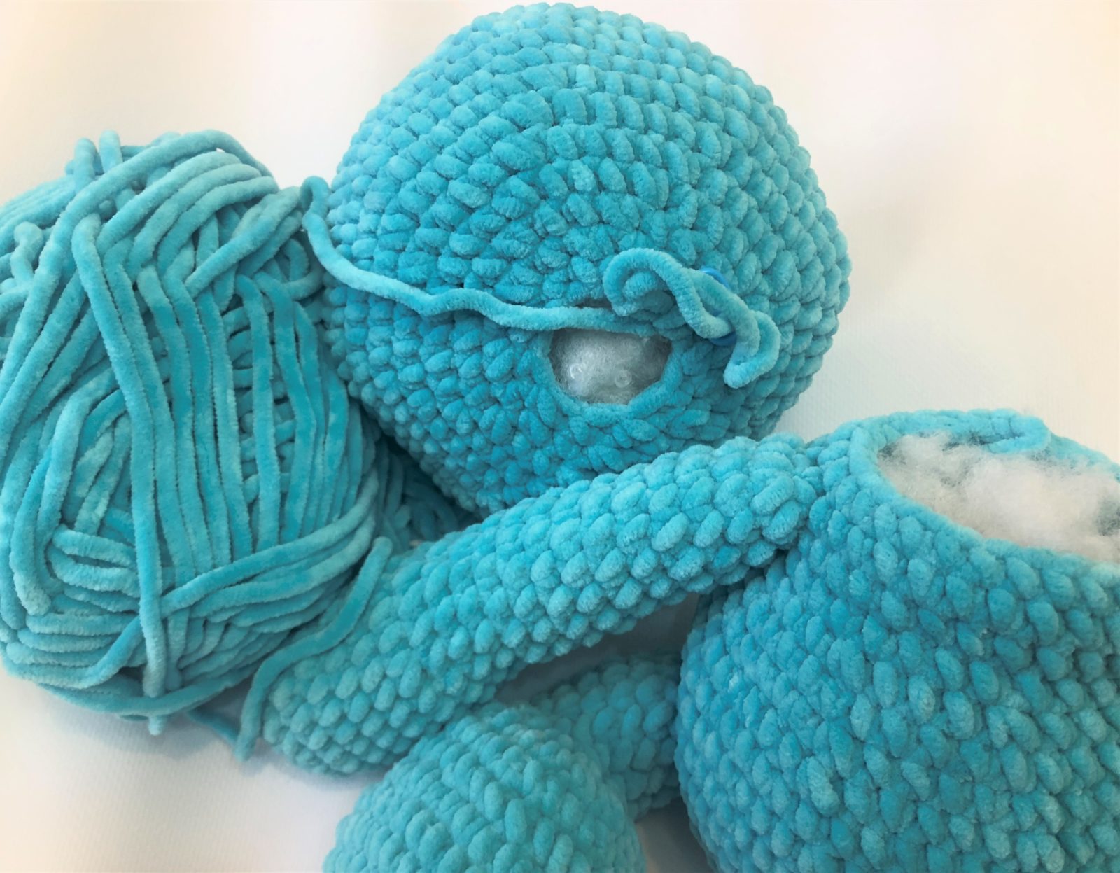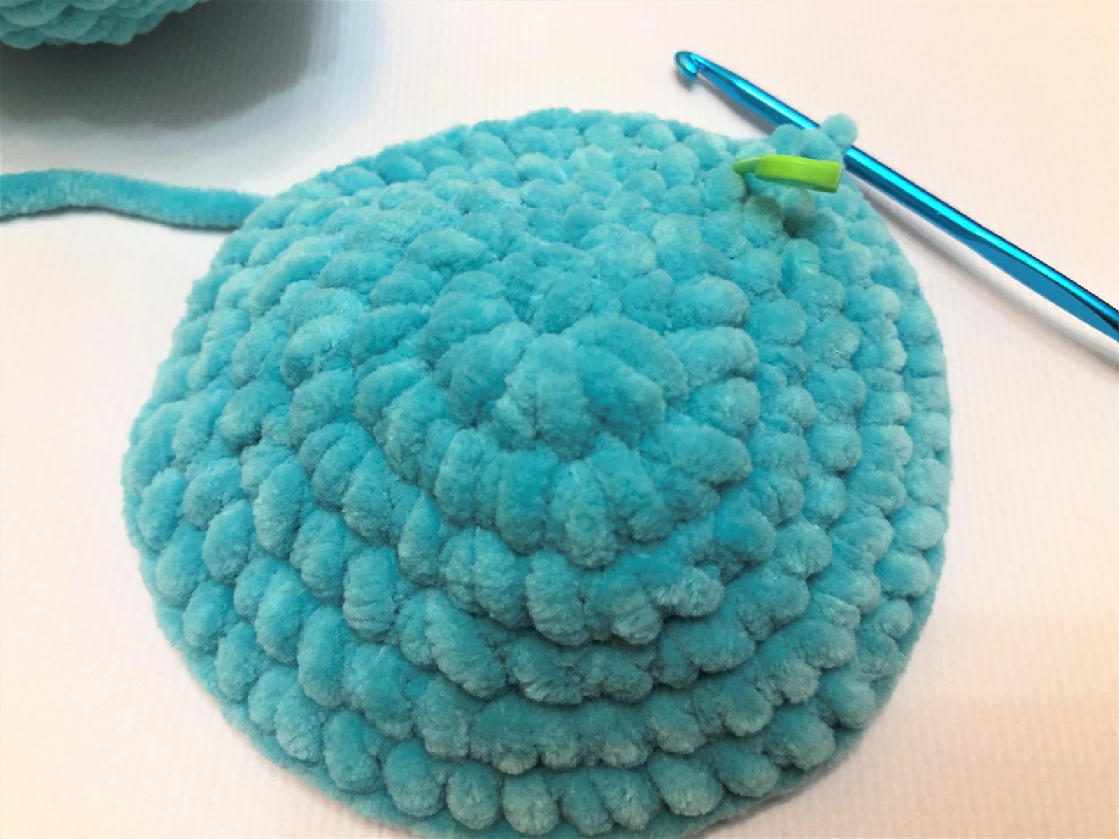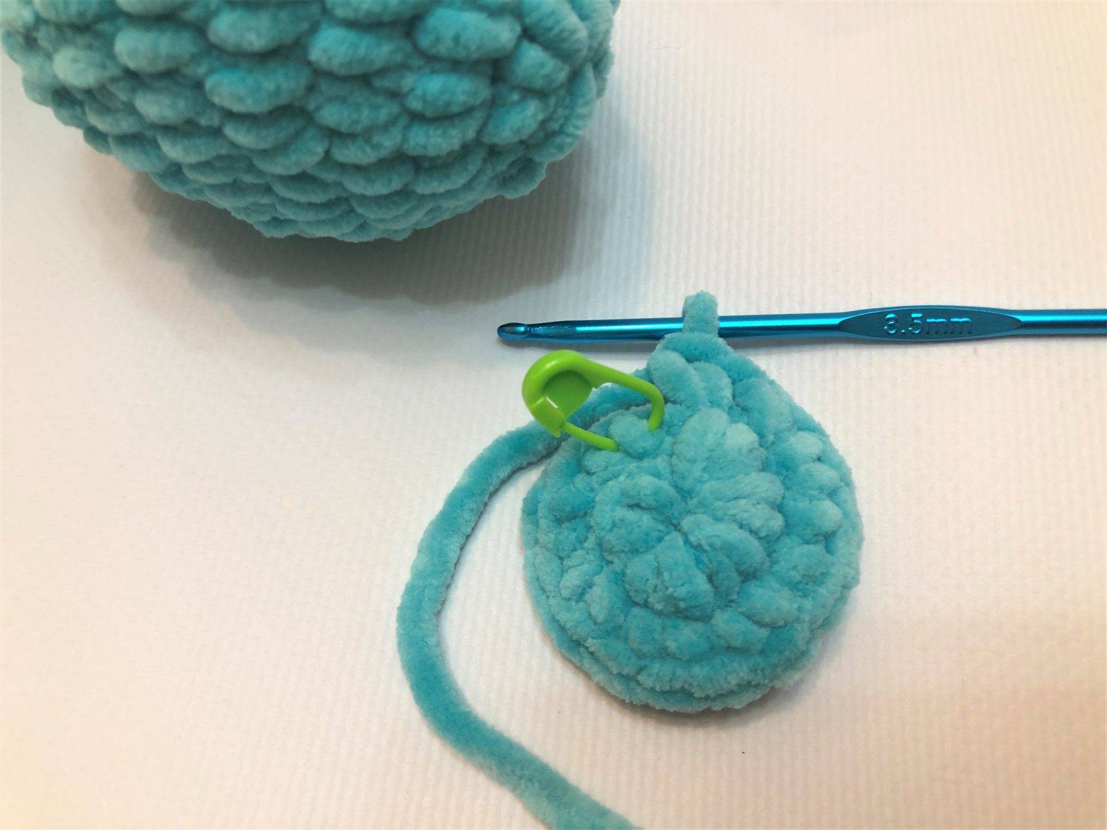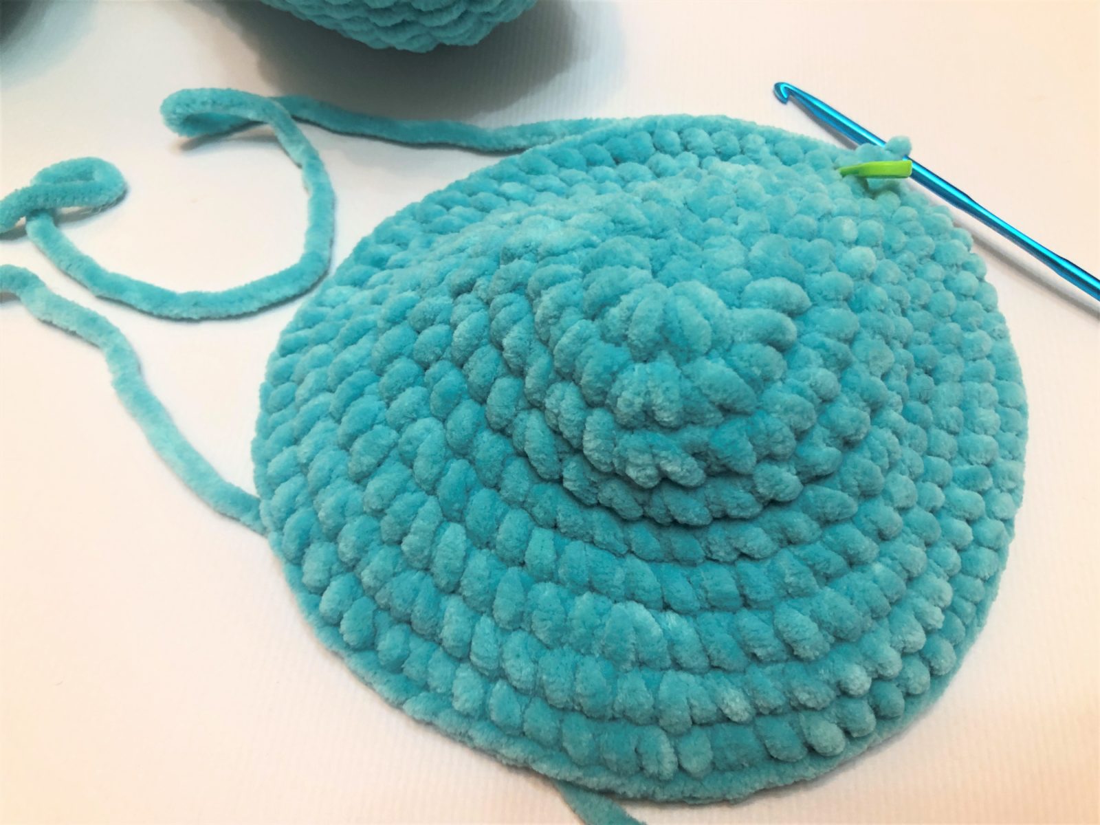 Далее снова производится прибавление — по 6 петель в 4-х последовательных ярусах. Это формируется голова. Потом по этой же схеме производится убавление. Когда останется 9 петель, нужно протянуть вдоль них нить и стянуть ее после набивки детали наполнителем.