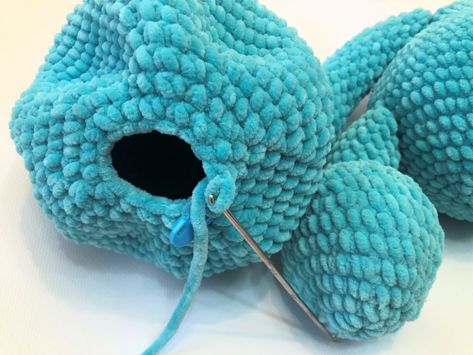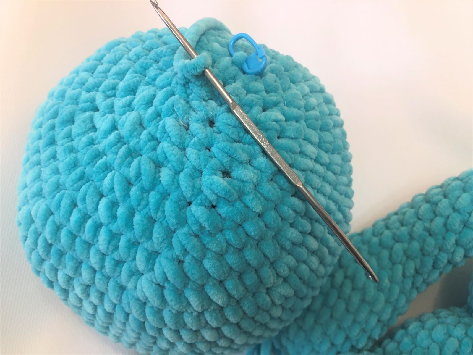 Перед тем как провязывать последние ряды, плотно набейте голову синтепоном, а только потом закрывайте петли. Если глазки будут вставляться, а не пришиваться или приклеиваться, то их тоже нужно вставить перед набивкой.