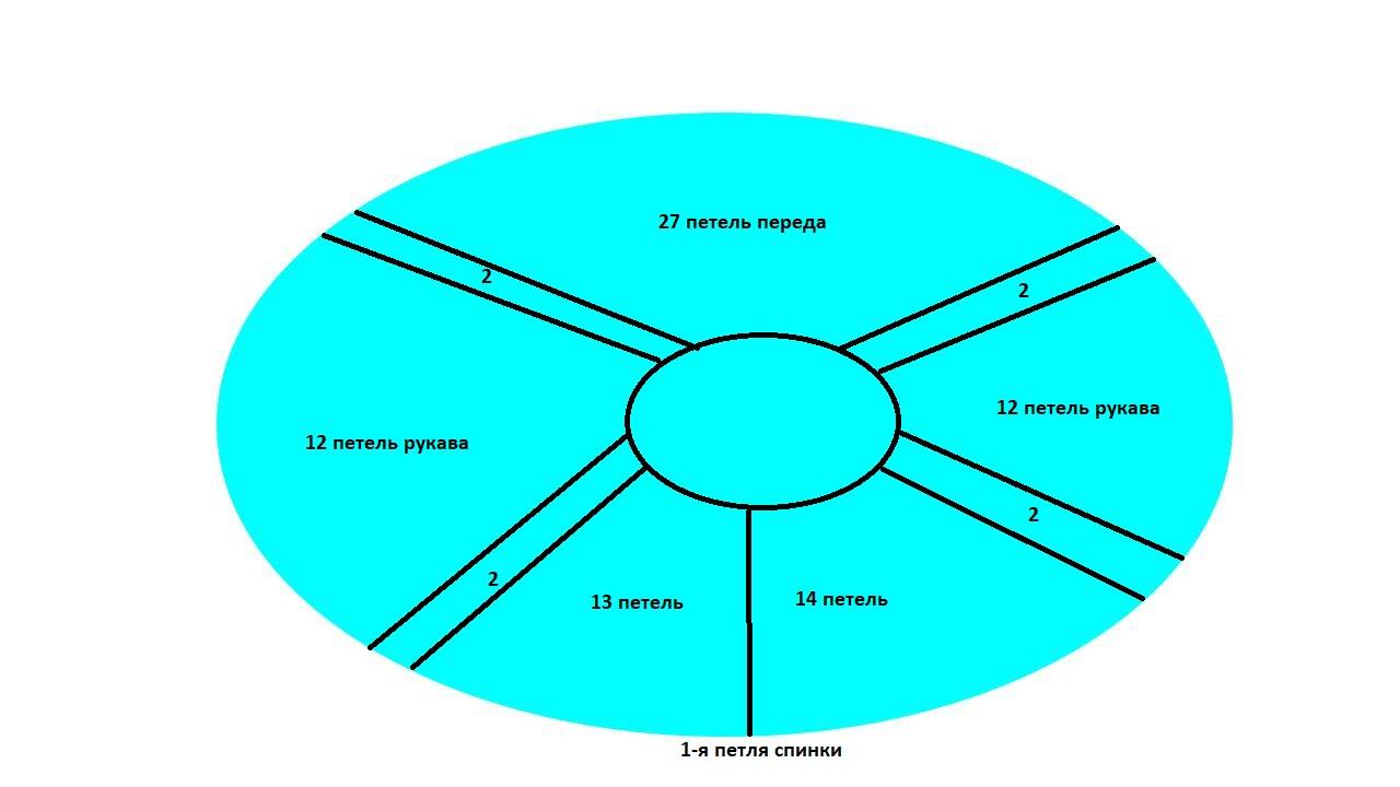 Продолжаем круговое вязание: вяжем 1 петлю реглана + все переднюю часть + 1 петля. И снова закрываем петли рукава тем же способом. + набрать 10 петель подреза.