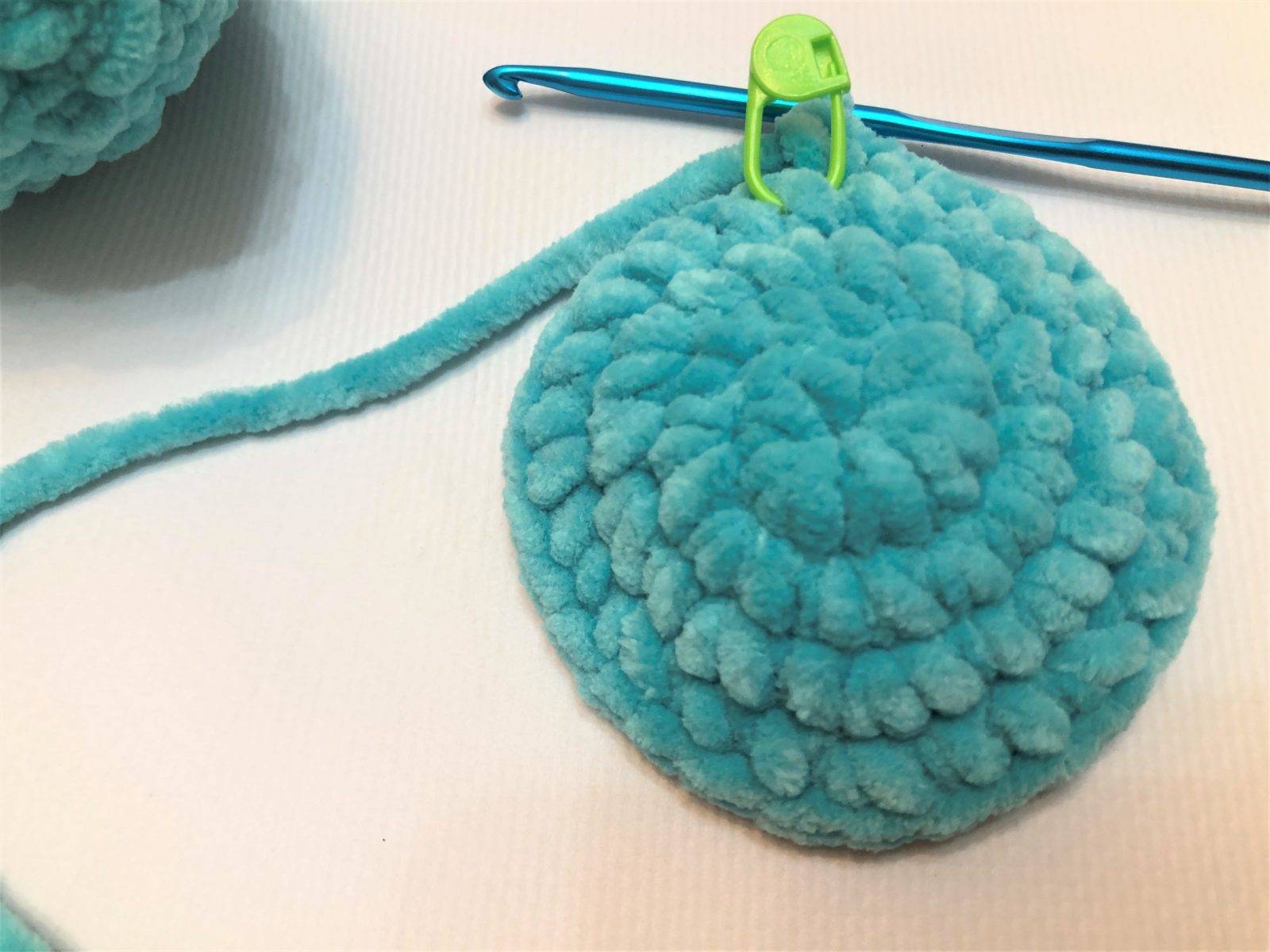 Таким же образом формируется вторая лапка, но рабочую нить обрезать не нужно. Стоит от второй лапы набрать цепочку из 4 ВП и соединить ее с первой конечностью. Далее делать еще 2 прибавления возле лап и вязать по кругу, таким образом, 6 рядов. Далее производится по 6 убавлений в 3-х следующих рядах.
