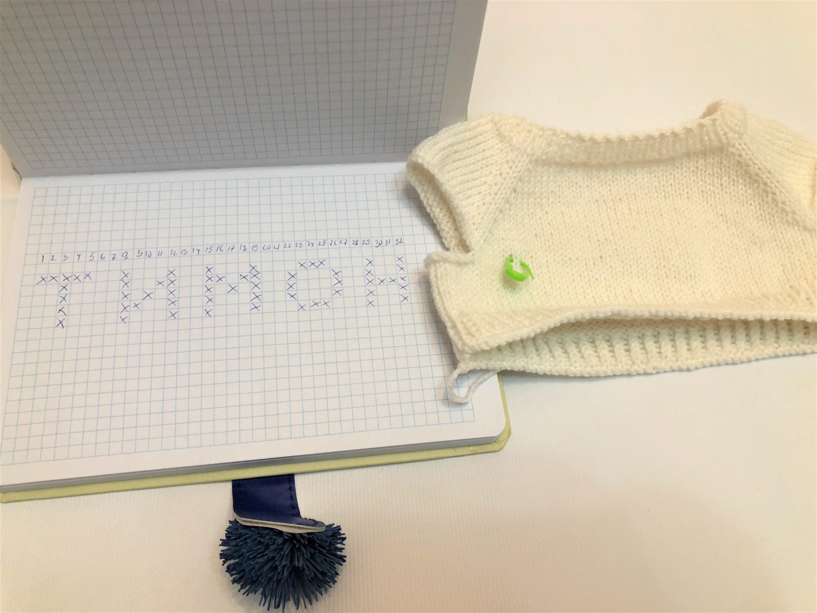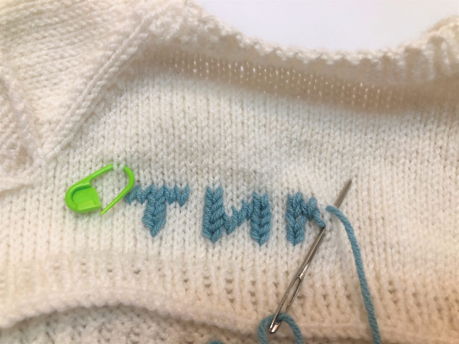 Может быть выполнена любыми способами. Если вы тоже хотите вышить имя, то обязательно посчитайте, хватит ли вам петель переда для выполнения вышивки.
