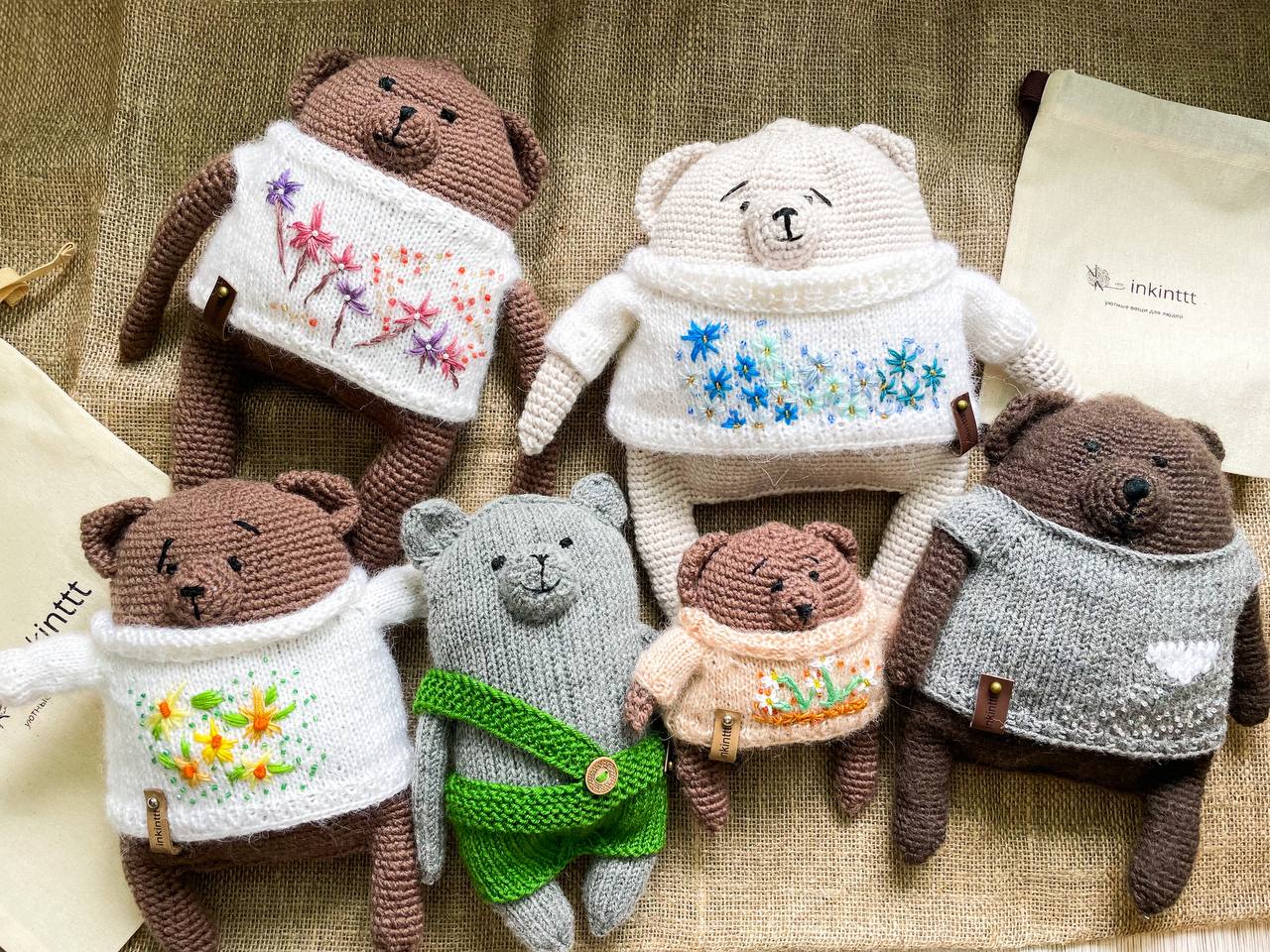 В итоге получается красивая игрушка, ничуть не хуже магазинной. При желании можно отдельно связать мишке шапочку, шарф или юбку.