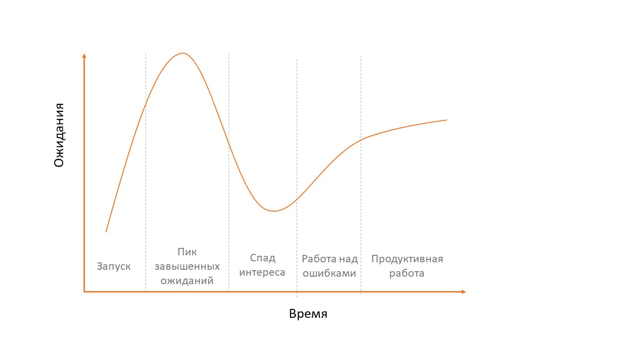 Это тот момент, когда про технологию еще известно мало, но у всех уже есть предположения, что в ней может быть потенциал. Ее пытаются приложить к различным ситуациям, и не везде это срабатывает, поскольку технология еще не развита. И если она не оправдала ожидания, то она начинает сползать в следующий этап, который называется «область разочарования». Затем некоторые технологии могут выходить на «плато продуктивности», размаштабированное применение в реальной практике рынка.