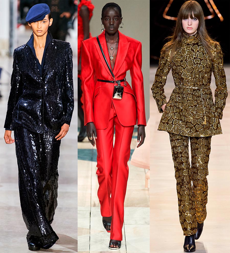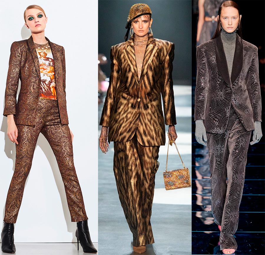 Не смотря на строгость и консервативность офисного дресс-кода, в грядущем сезоне скучные деловые костюмы можно будет разбавить яркими и сочными оттенками. На мировых показах главными фаворитами стали насыщенные красные, желтые, розовые, синие, зеленые и даже золотистые тона. Костюмы таких цветов станут прекрасным решением для торжественных рабочих мероприятий.