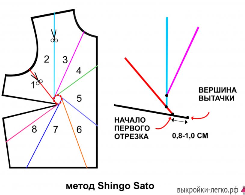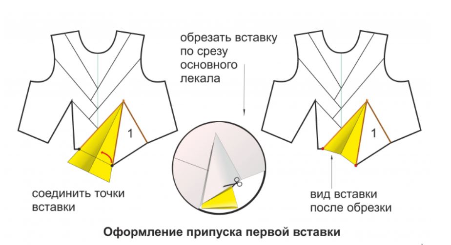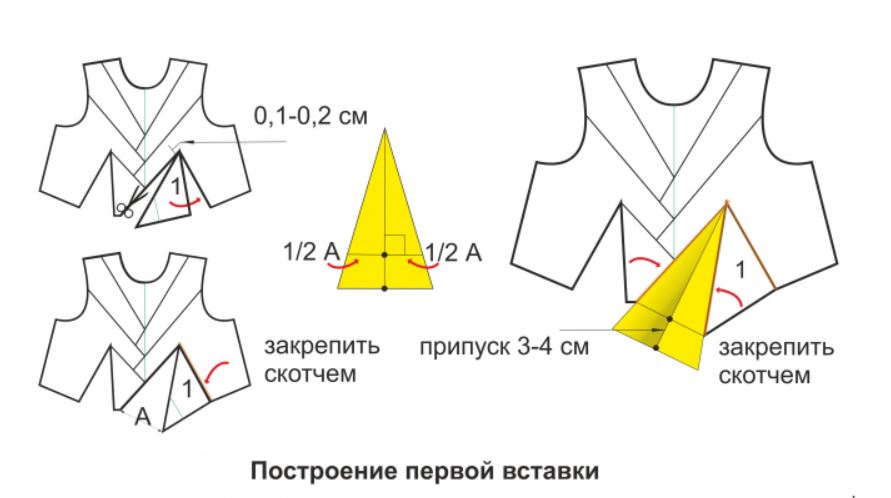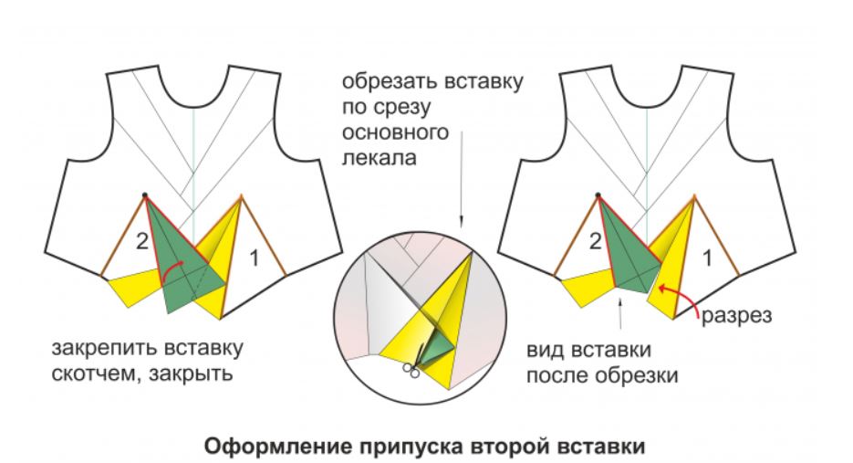 Разрезаем по 1-ой линии, не дойдя 0,1…0,2 мм до вершины. Закрываем вытачку, закрепляем скотчем.