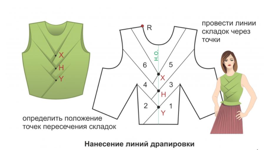 На первом этапе нужно определить оптимальное положение складок. Расположенные под острым углом они визуально уменьшают талию и вытягивают силуэт. При увеличении угла — расширят линию плеч и грудную клетку. Определившись, отмечаем точками X и Y места пересечения верхней и нижней складок. Для контроля рекомендуем замерить перед зеркалом расстояние от точки основания шеи R до точек X и Y. После замера уточняем это расстояние на чертеже. По центру между ними ставим точку Н.