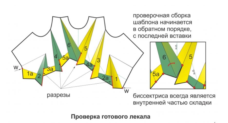 Сверяем совпадение длин соединяющихся лучей. При необходимости выравниваем нижние срезы плавной кривой. Определяем направление складок, указываем его стрелками.