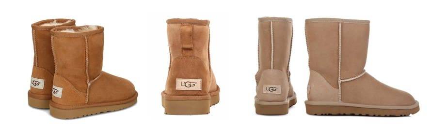 Угги изготавливают по особенной технологии: с внешней стороны — гладкая кожа, изнутри — натуральная овечья шерсть. Считается, что в них не жарко летом и не холодно зимой. Каноническая модель производится в песочном цвете длиной до середины икры или повыше лодыжки американским брендом UGG Australia.