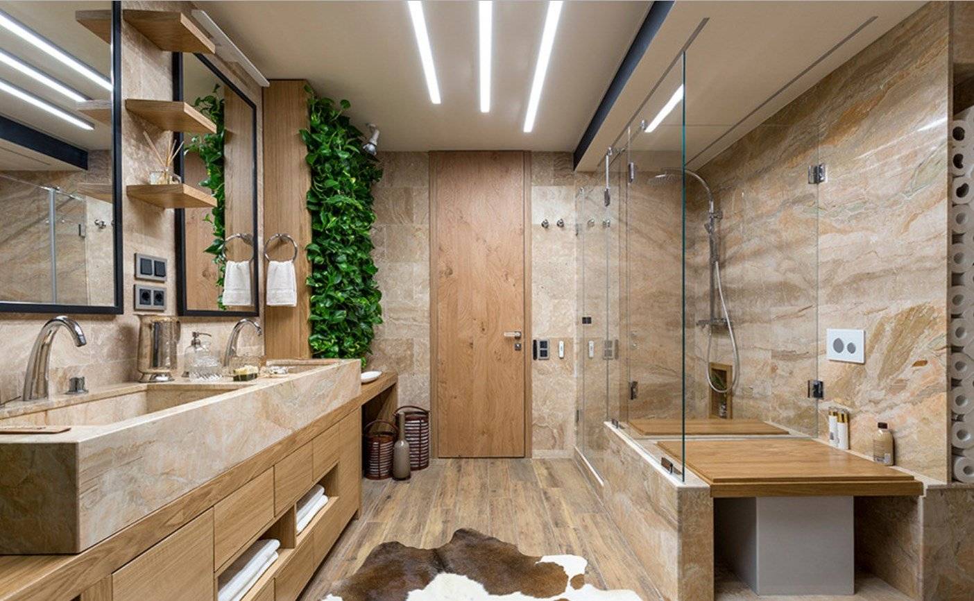 Архитектор и дизайнер Дмитрий Митин создал для пожилой пары ванную комнату в экостиле. Задача дизайнера была чётко сформулирована. Во-первых, дом был построен в 2002 году, поэтому на момент реконструкции интерьер ванной комнаты выглядел устаревшим. Дмитрий сделал вневременной дизайн помещения, используя именно экостиль.
