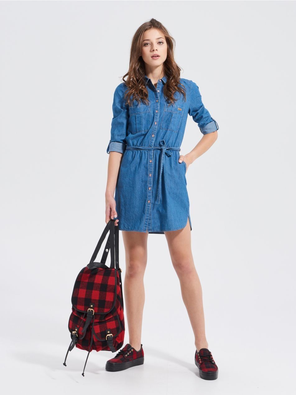 - Платье-рубаха. Джинсовое платье-рубашка – очень распространенная модель, которая прекрасно подойдет не только для стиля casual, но и для офисного стиля. Верх платья-рубашки напоминает кроем классическую мужскую рубашку с воротником-стойкой и манжетами на рукавах. Рукава, в свою очередь, могут быть любой длины, так же, как и юбка.