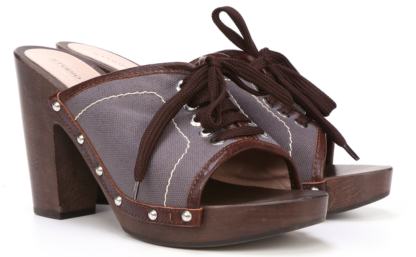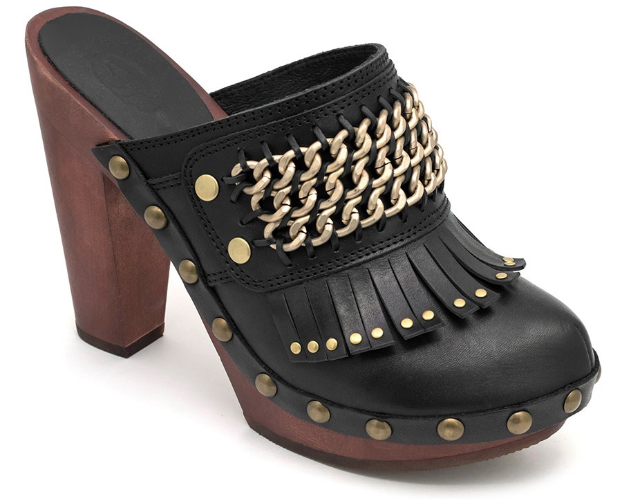 Клоги – вариация деревянных шлепанец с деревянной подошвой и кожаным верхом, его прикрепляли декоративными гвоздями. Такую обувь носили в Великобритании. Эта модель подойдет для жарких дней. Деревянные изделия можно сочетать платьями и брюками из легкой шифоновой ткани.