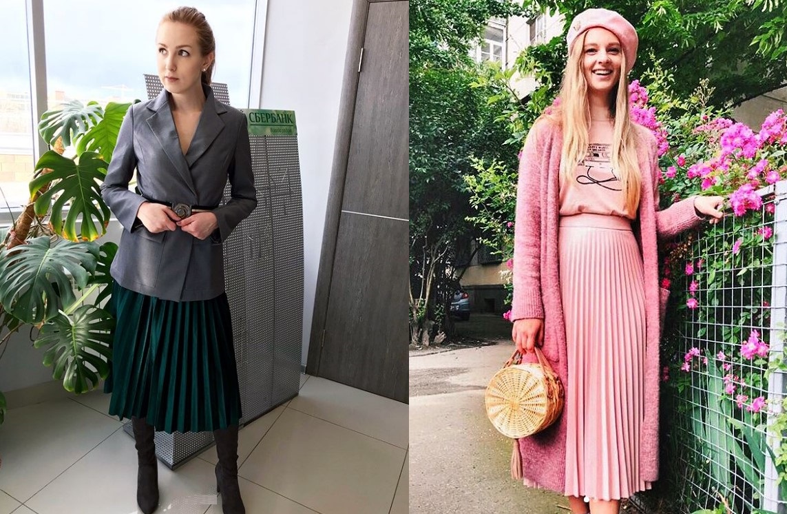 В отличии от юбок-солнце, плиссе подходит для создания нежного, женственного образа так же хорошо, как и для экстравагантного-агрессивного. Если совместить нежную юбку плиссе с кожаным черным жакетом, к примеру, – получим одновременно женственный и сильный образ.