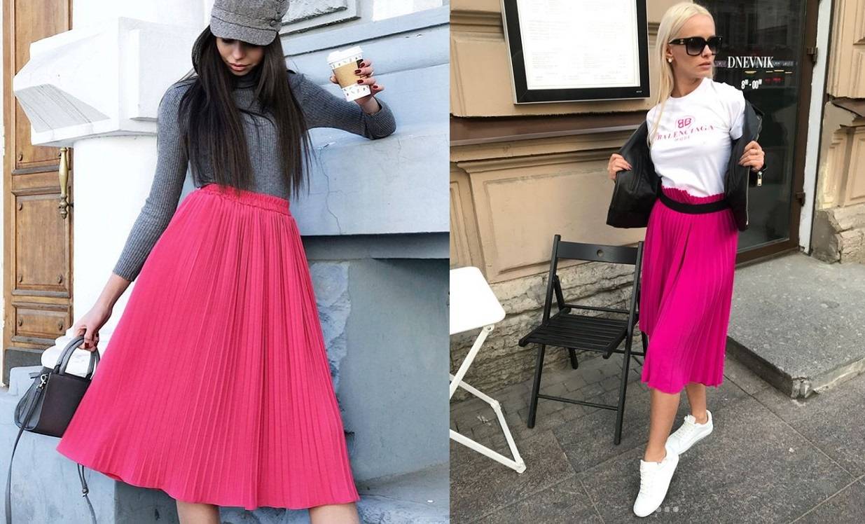 Гофрированная юбка в сочетании с кроссовками выглядит неординарно и современно. Такая комбинация подойдет для тех, кто не боится смешивать стили в своем имидже.