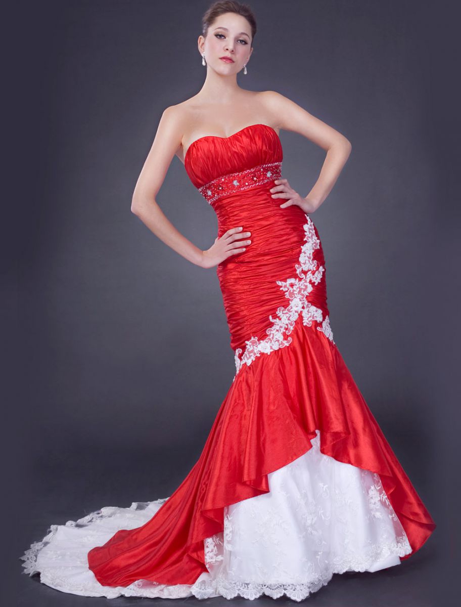 Для тех кто не рискует облачиться в полностью красное платье, можно присмотреться к белым моделям с красными элементами декора. Такой образ придаст девушке решительности, при этом покажет её девичью привлекательность.