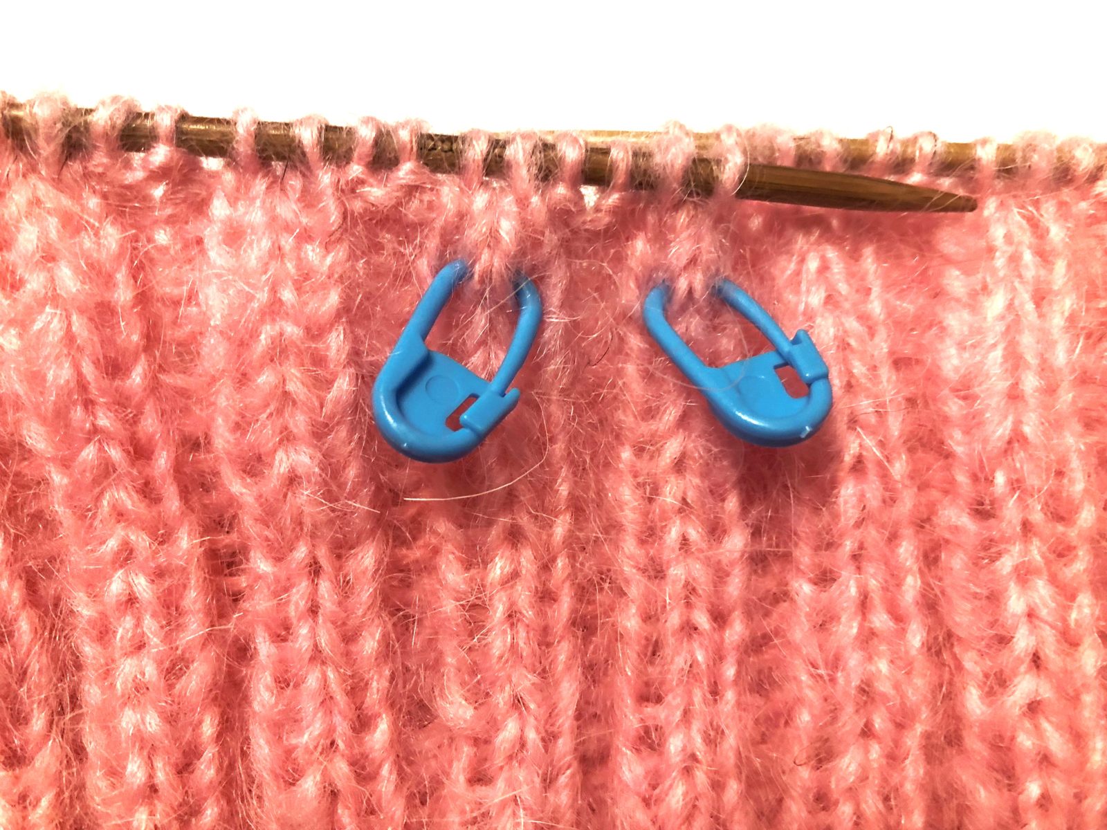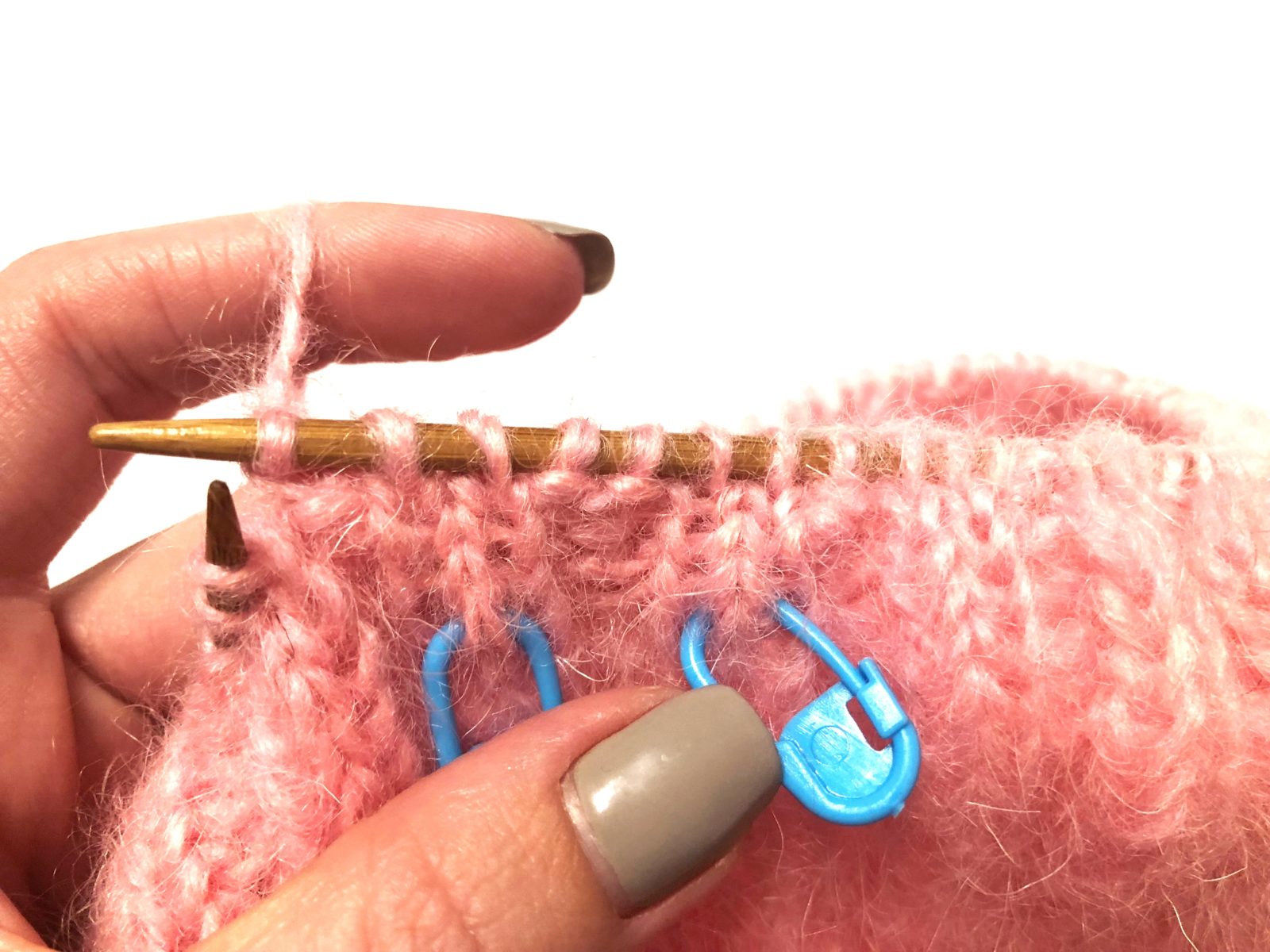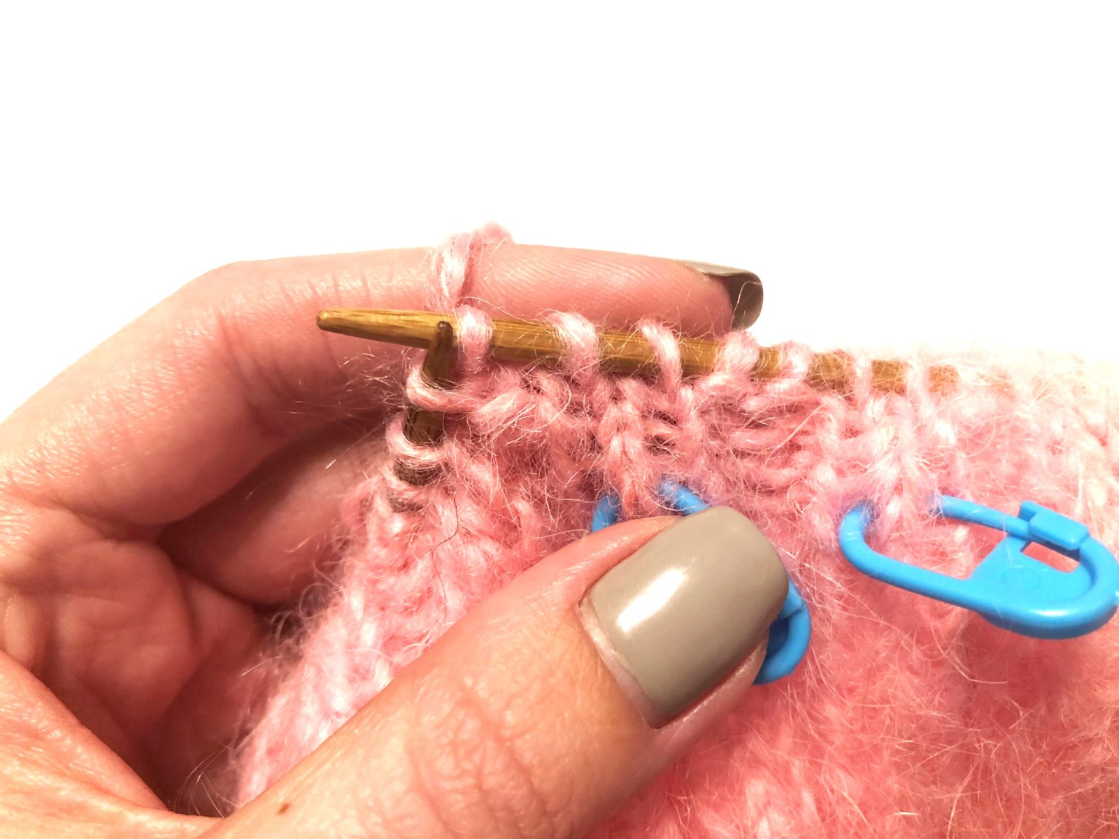 2. Провяжите первый ряд ЛП. Подойдя к концу ряда, закрепите узлом рабочую нить и конец нити, оставшийся от набора петель. Так вы замкнете КР. После образования КР, наденьте на правую спицу кольцо-маркер. Такое кольцо, находящееся между первой и последней петлей ряда, позволит легко контролировать количество провязанных рядов и не терять начало КР.