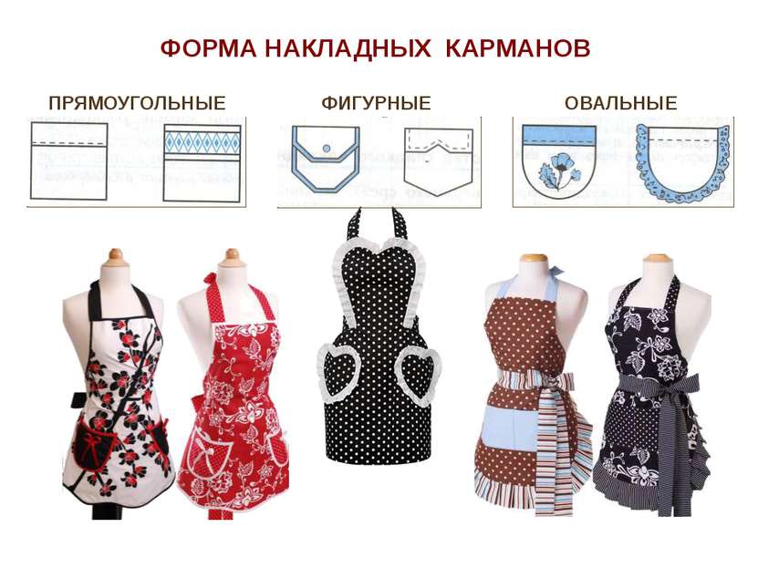 Самые простые накладные карманы применяются в лёгком платье, мужских сорочках и брюках. Вертикальные линии у карманов параллельны.