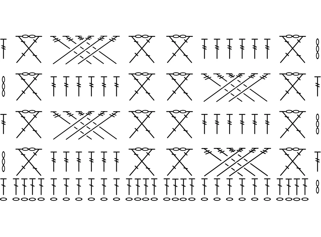 Ажурный узор 2 (ширина 7 п.): вязать по схеме 3, на которой приведены только лиц. р., в изн. р. все петли вязать по рисунку, накиды – изн. Повторять петли раппорта и с 1-го по 14 р.