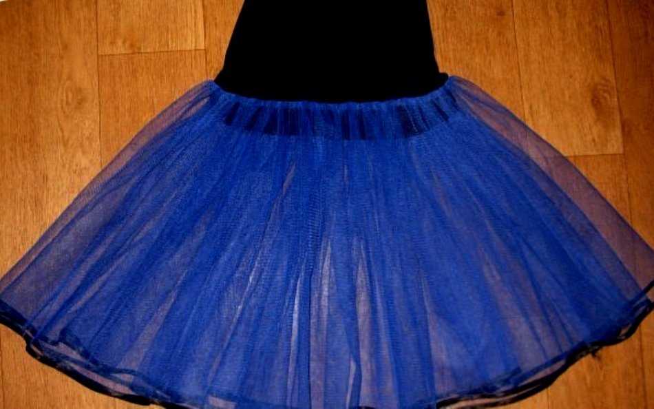 - 1 слой – короткий подъюбник из фатина. Длина подъюбника 60-70 см. Чтобы юбка была пышная, ткани понадобится, при ширине 1,4 м – 2 длины. В поясе ткань собираем по объему талии.