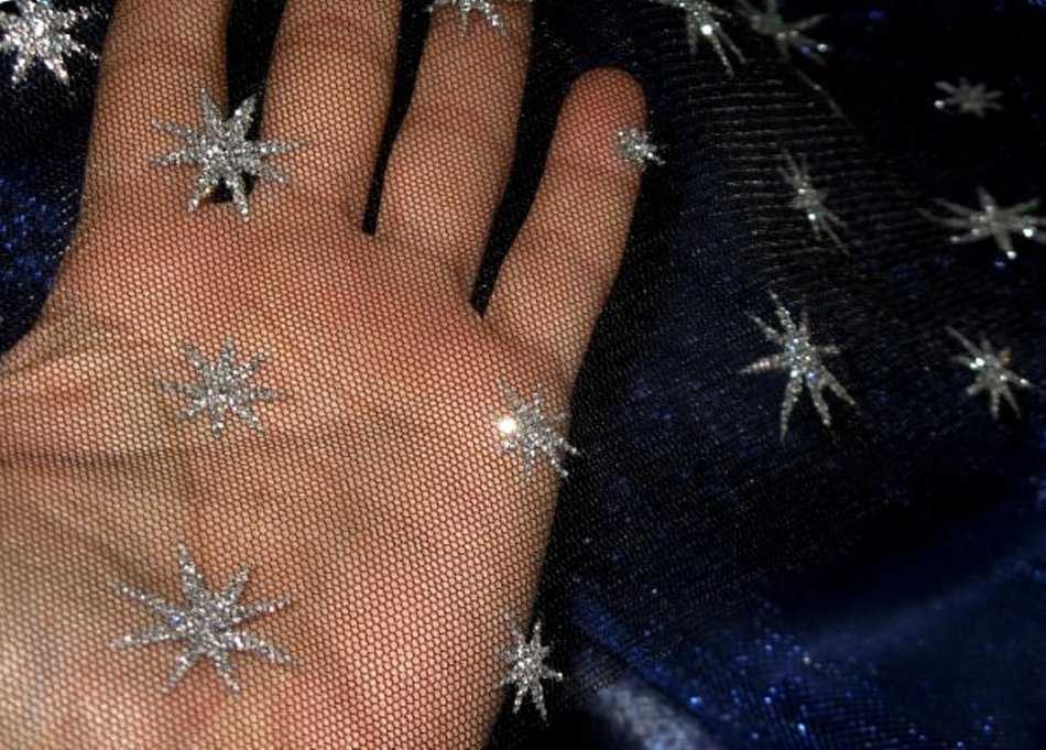 - 4 слой – длинная юбка из фатина или шифона со звездочками, длиной 100-120 см. Можно взять материю без узора, а звездочки вырезать из тонкой фольги, и прикрепить к готовой юбке.